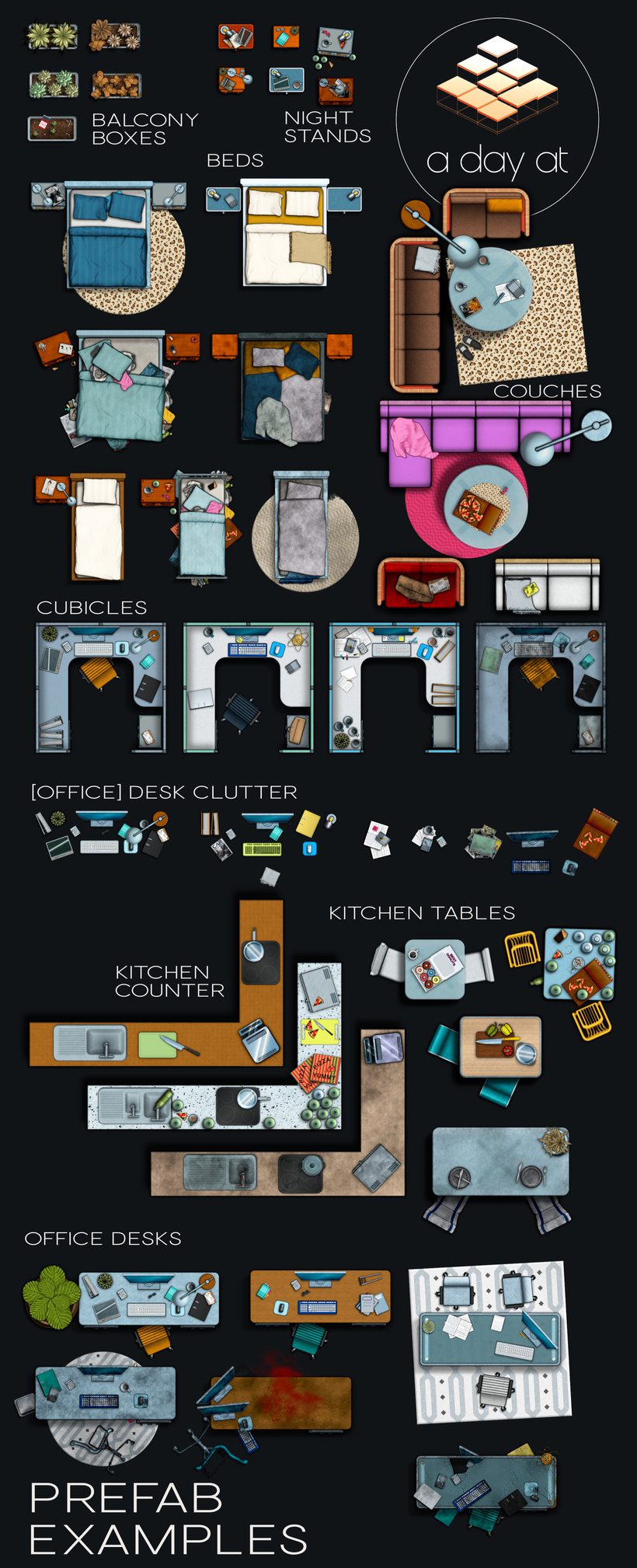 balcony boxes – beds – couches – cubicles – desk clutter – kitchen counter – kitchen tables – nightstands – office desks
