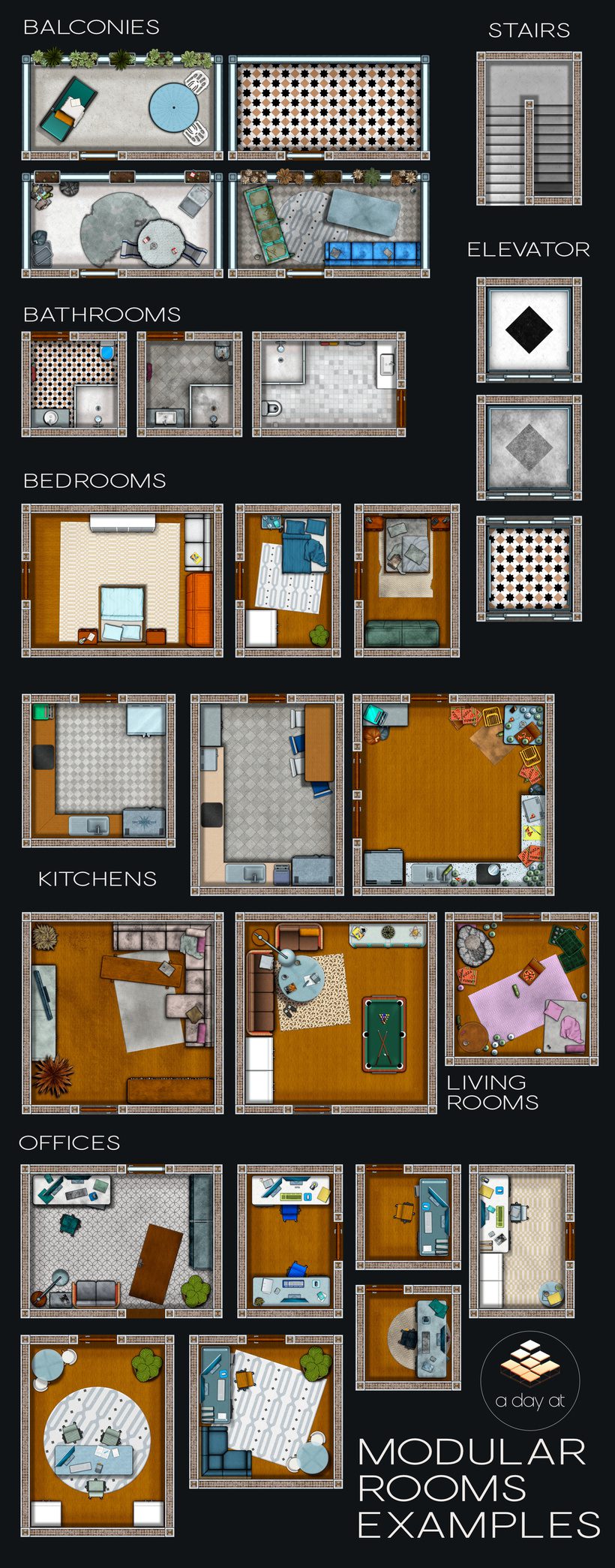 The following room types (most) with different variations are part of this pack: