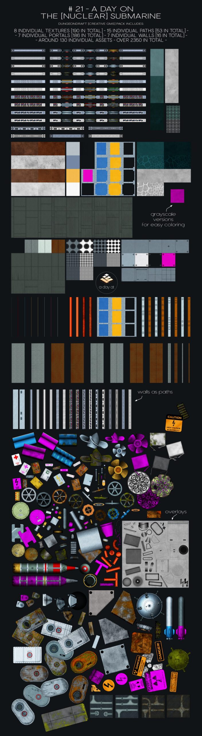 The pack includes all assets as Dungeondraft objects and additional Dungeondraft specific content – such as paths, textures, colorable assets and more