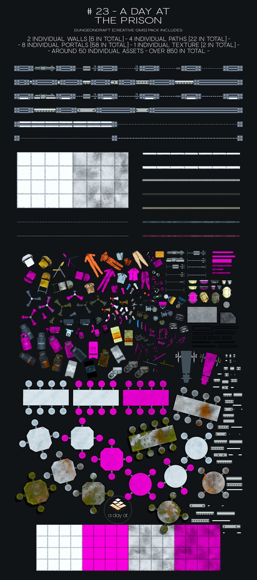 The Dungeondraftpack includes all assets as Dungeondraft objects and additional Dungeondraft specific content – such as paths, textures, colorable assets and more