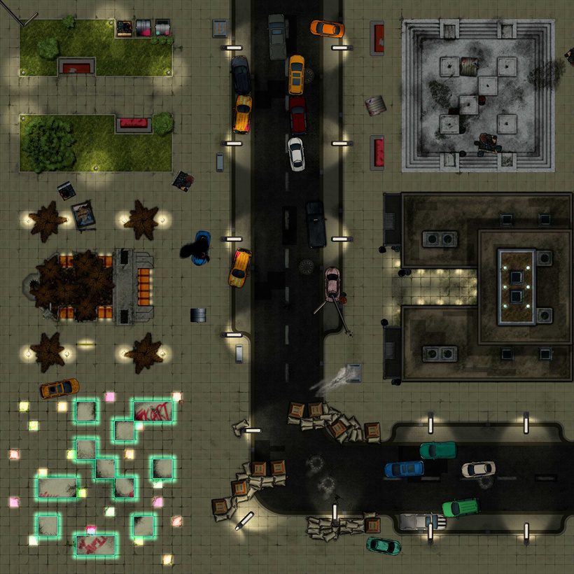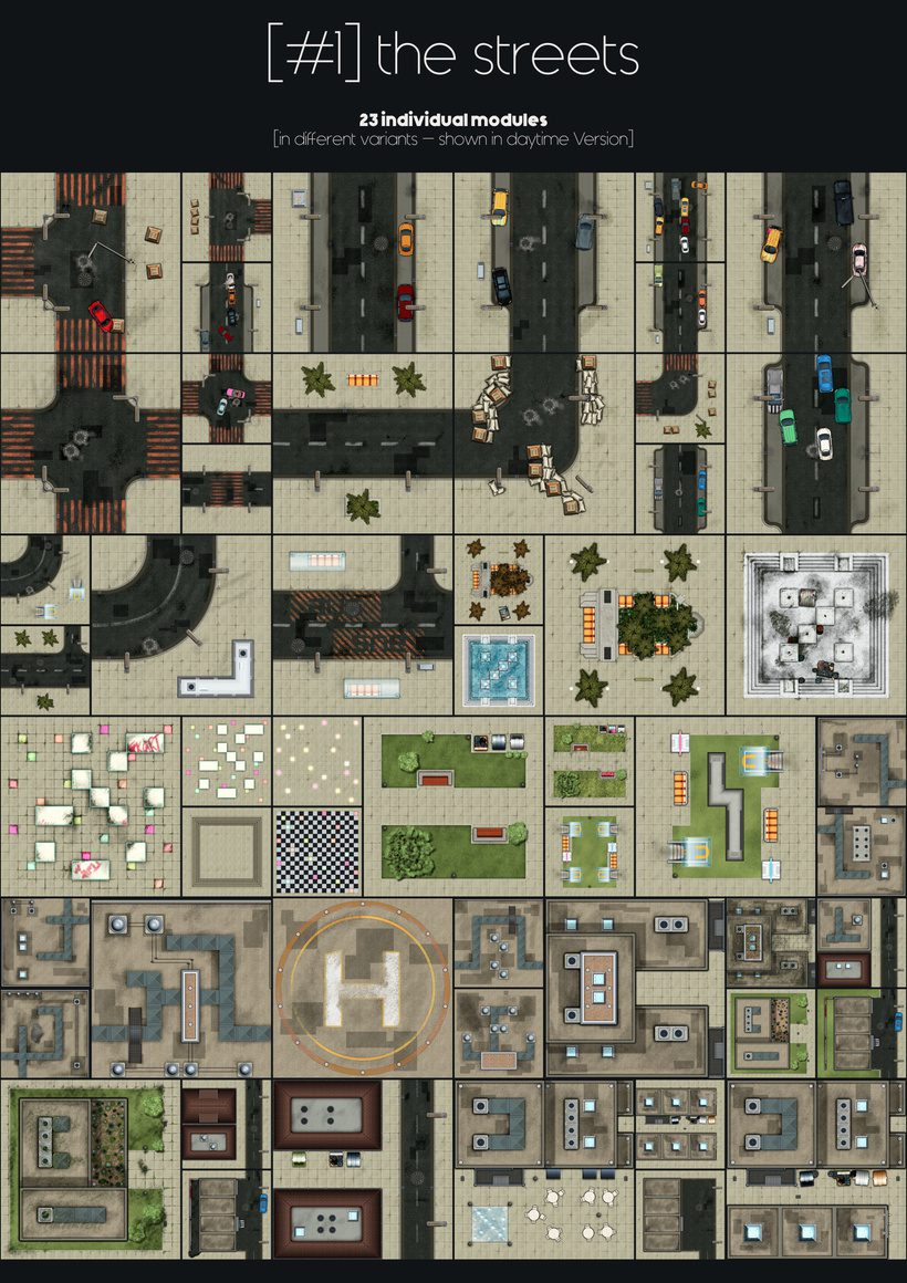 For the launch I decided to cover the basics that everyone will need eventually when playing in an urban area. You get different street types, a few city squares and roofs to provide your sniper with some highground. This should have you covered if your players decide to challenge the NPCs to a little shootout on the street. Or whatever your unpredictable players have in mind anyways.