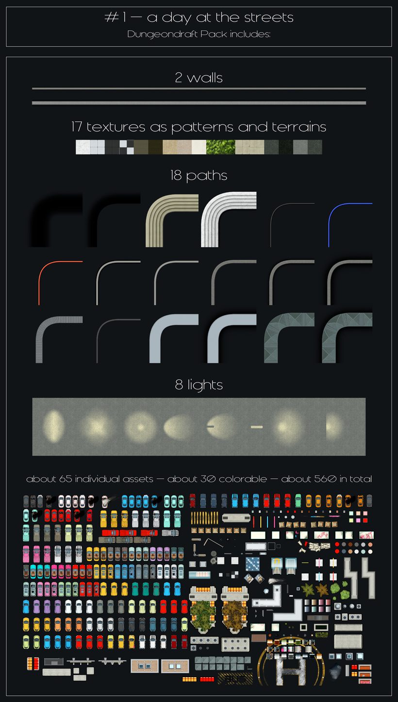 – including all assets as Dungeondraft objects as daytime variant and additional Dungeondraft specific content – such as paths, textures, colorable assets and more